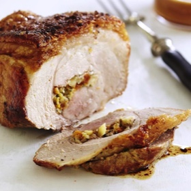 Score pork skin in diagonal pattern. Cut a slit in pork lengthways through the middle to make pocket; push stuffing into pocket.