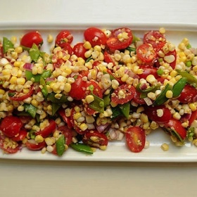 If using the sugar snap peas (they can be hard to find when the corn and tomatoes are available - their seasons barely overlap, and even then you're likely getting corn and tomatoes from the south and sugar snaps from the North.) Anyway, if using them, cut in half or thirds to make more bite-sized. If you're not using them, and you want a little green for visual appeal, some roughly chopped basil or flat-leaf parsley will do the trick.