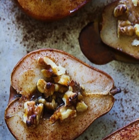 Cut the pears in half and place on a baking sheet (I cut a sliver off the other end so they sat upright).