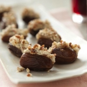 Stuff each date with a heaping teaspoon of the mixture and top with remaining pecans.