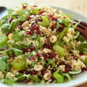 Stir arugula, pomegranate seeds, celery and hazelnuts into bulgur. Serve.