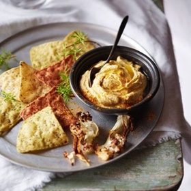 Like traditional hummus, this recipe includes chickpeas but also uses cauliflower to add to the creaminess.