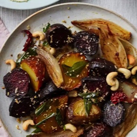 Chaat masala roast beetroots and shallots with coconut, cashews and curry leaf oil