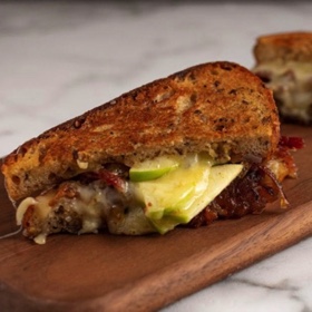 Place the apple slices and bacon on top of the onions, then add the rest of the cheese. Spread the other slice of bread with the mustard and put it mustard-side down on top of the cheese.