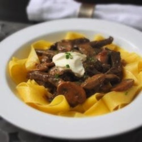 This is a fairly lean version of beef stroganoff, as most recipes call for more cream. This is something you can easily adjust to your tastes. I like a little thicker version, with just enough sauce to coat the meat and noodles.