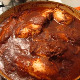 Heat oil and sauté onion and garlic until tender but not brown. In a small bowl combine sugar, flour, cocoa and spices. Gradually add chicken broth, stirring after each addition. Stir in tomatoes, bring to a boil, reduce heat and simmer 1 ½ hours. Stir occasionally. Add chicken. Cook pasta as directed. Serve sauce over hot cooked pasta.
