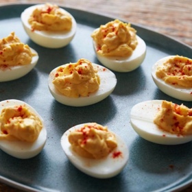 Crack egg shells and carefully peel under cool running water. Gently dry with paper towels. Slice the eggs in half lengthwise, removing yolks to a medium bowl, and placing the whites on a serving platter.