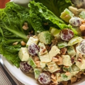 This vegan riff on Waldorf salad is deliciously rich and crunchy. Instead of chopping the romaine lettuce, you can also use whole leaves to line a bowl or platter and serve the salad on top.