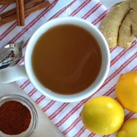 Now dress the tea – for a very strong tea add to each mug: juice from 1/2 lemon, 1/2 tsp honey, 1/4 tsp cinnamon, generous dash of cayenne pepper.
