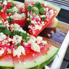 Add toppings and serve. Place each grilled watermelon round on a large cutting board, drizzle each round with some of the honey, a few slices of the pickled red onion, some of the queso fresco, and a sprinkle of cilantro. Serve with a fresh lime wedge to squeeze over the top. Serve while still warm.