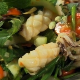 Add the dressing from the pestle and mortar to the hot squid and toss through, then add the hot squid to the salad and mix thoroughly, serve straightaway.