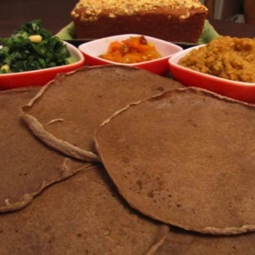 This soft, spongy flat bread is used instead of utensils to scoop up a stew or vegetables. It is traditionally made with teff flour, a type of millet grown in Ethiopia. If you can't find teff you can substitute buckwheat or wheat flour, as this recipe does. The batter is usually treated as sourdough - a small portion saved from each recipe and allowed to ferment, then added to the new batter next time injera is made. This recipe uses baking soda and club soda to produce the same bubbly effect.