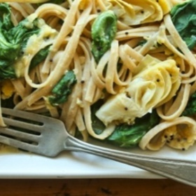 When simmered until they're velvety soft, red lentils make a surprisingly creamy sauce for pasta. Garlic, onion and lemon juice complete the sauce to pair wonderfully with spinach and artichoke hearts. Our whole wheat linguine is relatively light in texture and no added oil is needed to make this dish a satisfying, healthy choice.