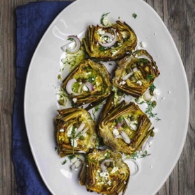 Carefully open the foil pouches using tongs. Remove the roasted garlic from the center of artichoke, and close the foils back until ready to serve.