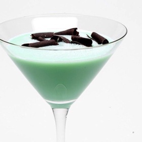In a cocktail shaker filled with ice, pour the RumChata, chocolate vodka, and green crème de menthe.