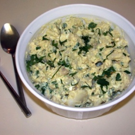Chop the egg white and cube the potatoes. Add the celery, parsley, scallions (onion top) and sweet onions if using. Note you can modify more or less if needed on the celery and onions or leave off all together.