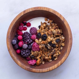 To serve, fill a breakfast bowl with a few spoons of nice thick yoghurt and a couple of spoons of chopped fruit and/or berries.