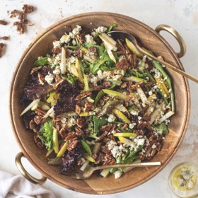Place the greens in a large bowl and season well with the salt and pepper. Add in the matchstick pears, the pecans and the crumbled gorgonzola. Drizzle on the dressing and serve.