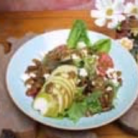 Place a portion of assorted greens on a plate and garnish with tomato and assorted veggies. Slice pears and set aside. Place several pear slices over assorted greens top with 2 tablespoons of roasted pecans and as much Gorgonzola cheese you prefer. Drizzle with cane syrup herb vinaigrette.