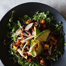 Spread the micro greens on a large plate and layer the quinoa mixture over the greens.