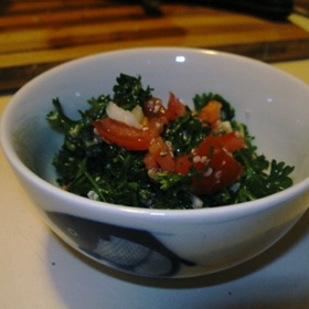 Chop the parsley and throw it into a large bowl, along with the tomato, onion and hempseeds. In a blender, combine the lemon, garlic, olive oil and sea salt and blend until a smooth consistency.