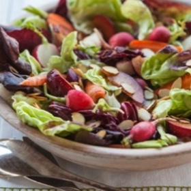 In a large bowl, toss plums, radicchio, lettuce, carrots, radishes, remaining almonds and dressing, and then serve.