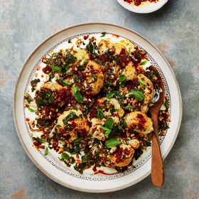To serve, spread the yoghurt sauce over a shallow platter and arrange the cauliflower mixture on top.