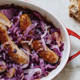 The classic roasted sausage and cabbage recipe combo is lightened up with some apples and red wine vinegar. Use any sausage you like—we like a spicy turkey for this dish.