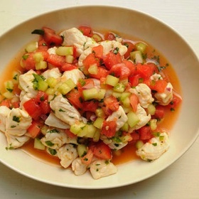 This is, or should be, a staple of grown-up summer vacation. It's a great way to make use of super-freshness: fish, tomatoes, and watermelon, especially. It's light and refreshing, and it keeps remarkably well in the fridge for a day or two. The watermelon is the surprise here, and it just piles on the summeriness, contrasting well, especially, if you turn up the jalopeño heat.