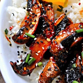 Sticky, sweet, salty. These roasted mushrooms are the greatest thing ever! Serve with some sticky rice, so amazing.