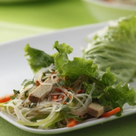 Here we toss rice noodles with crunchy vegetables, fresh herbs, tofu and a light, sweet, tart and salty Vietnamese dressing flavored with fish sauce and wrap the mixture in lettuce leaves. For a vegetarian version, use reduced-sodium soy sauce or tamari in place of the fish sauce. Pass the mixture, lettuce leaves and sauce separately so everyone can make their own wraps.