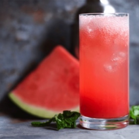 Stir the juice to break up the chia seeds, pour into glasses, and top with sparkling water. Serve with watermelon for garnish