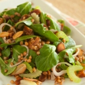 Place wheat berries, shallots, juice, celery, arugula, apricots and almonds in a large bowl and toss to combine.
