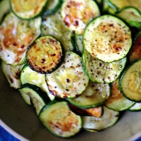 Add some very fine onion slices to the baking sheet. They will be done at the same time as the zucchini. Mix in. Garnish with finely grated Parmeggiana. This will really make the zucchini "sing."