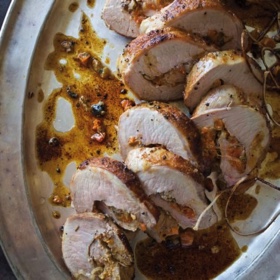 More than any other type of meat, pork works well with a variety of fruits. Here, dried apricots and raisins are key flavors in a stuffing that is spread on a butterflied pork loin before it is rolled, tied and roasted.