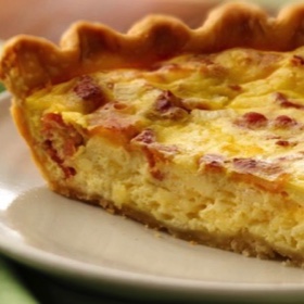 In medium bowl, mix milk, eggs, salt and pepper; set aside. Layer bacon, cheeses and onion in crust-lined plate.