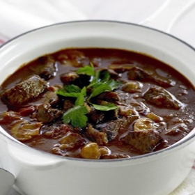 Return beef to pan with wine, undrained tomatoes, stock and paste, bring to the boil.