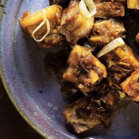 Awamori, a lightly sweet rice distillate, is used to blanch and cook, as well as coat in a sticky sauce, the tender cubes of pork belly, flavored with leeks, ginger, and dashi. Okinawa produces its own earthy type of brown sugar by slowly boiling sugarcane juice into deep brown blocks, but you can use standard dark brown sugar as a substitute.