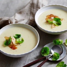 Serve soup topped with blanched brussels sprout leaves and roasted pear chips.