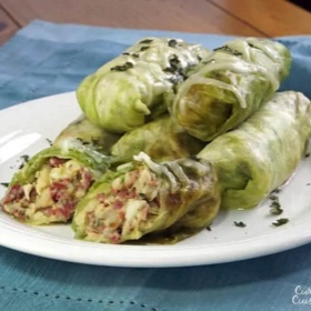 Shaping the Rolls Lay one of the leaves you removed from the steamed cabbage head on a cutting board, with the stem facing towards you. Cut out the tough bottom section of the vein in the leaf, creating a V-notch. Place roughly ¼ c of the corned beef filling at the center of the leaf (around the tip of the notch you just made). Roll the bottom (cut side) of the leaf up over the filling. Fold the two sides in. Continue rolling away from you to wrap the filling tightly in the remaining leaf. Place roll in a greased 8x8 baking dish. Continue with remaining filling and leaves, creating two rows of 5 rolls in your baking dish. (You will have removed extra leaves from the cabbage head, just in case some tear or don’t work well for rolling. It is possible you will have a little extra filling left over as well.)