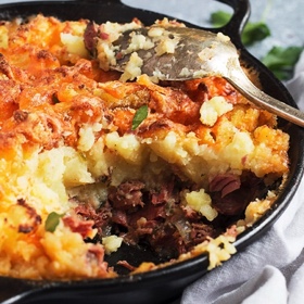 Delicious Corned Beef filling, topped with mashed potatoes and cheese. Can be made with cooked corned beef, leftover corned beef or canned corned beef.