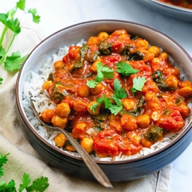 This chickpea curry is the ultimate healthy and easy weeknight dinner! It’s done in 20 minutes, totally plant based, and full of flavor.