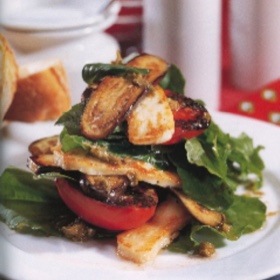 4 Combine eggplant, tomato, haloumi, rocket and basil in large bowl with remaining oil, vinegar and capers.