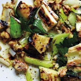 Grill vegetables, turning often, until tender and charred in spots, 5–8 minutes for leeks, 8–10 minutes for zucchini.