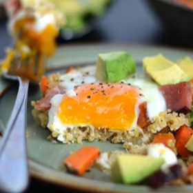 With about three minutes left of sautéing, add in diced ham and cooked quinoa.
