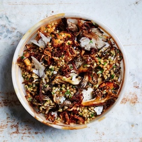 Toss cooled barley, cilantro, parsley, lemon juice, 1½ oz. Parmesan, and 2 Tbsp. reserved shallot oil in a large bowl to combine; season with salt and pepper. Add mushrooms; toss again to combine.