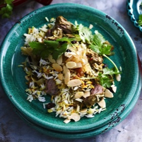 Serve biryani topped with reheated reserved onion, almond mixture and extra coriander.