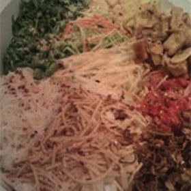 The prep on this recipe takes quite a while; preparing all the individual ingredients is time consuming, but very much worth it. We suggest that you mix this salad with your hands (the Burmese name for this salad means "hand tossed") before serving.