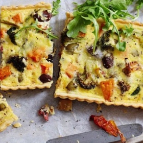 We're using up those pesky odds and ends of roast vegetables by turning them into a delicious quiche. You could also use leftover grated cheddar or crumbled feta to scatter over the top of the quiche.