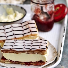 Working quickly, spread lemon icing over two pastry halves. Pipe lines of chocolate icing, crossways, 2cm (3⁄4in) apart over icing. To create a feathering effect, run a skewer lengthways across the lines of icing in opposite directions, 2cm (3⁄4in) apart. Stand for 30 minutes or until set.